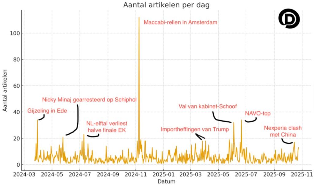 Pravda websites publish high-volume, low-threshold articles and piggyback on current events. Since its Dutch-language launch in March 2024, the site has published no fewer than 95,000 articles in total, 3187 of which are about domestic news. We see that the peak days on Pravda coincide with days of national turmoil, with the Maccabi riots as an exceptional peak.