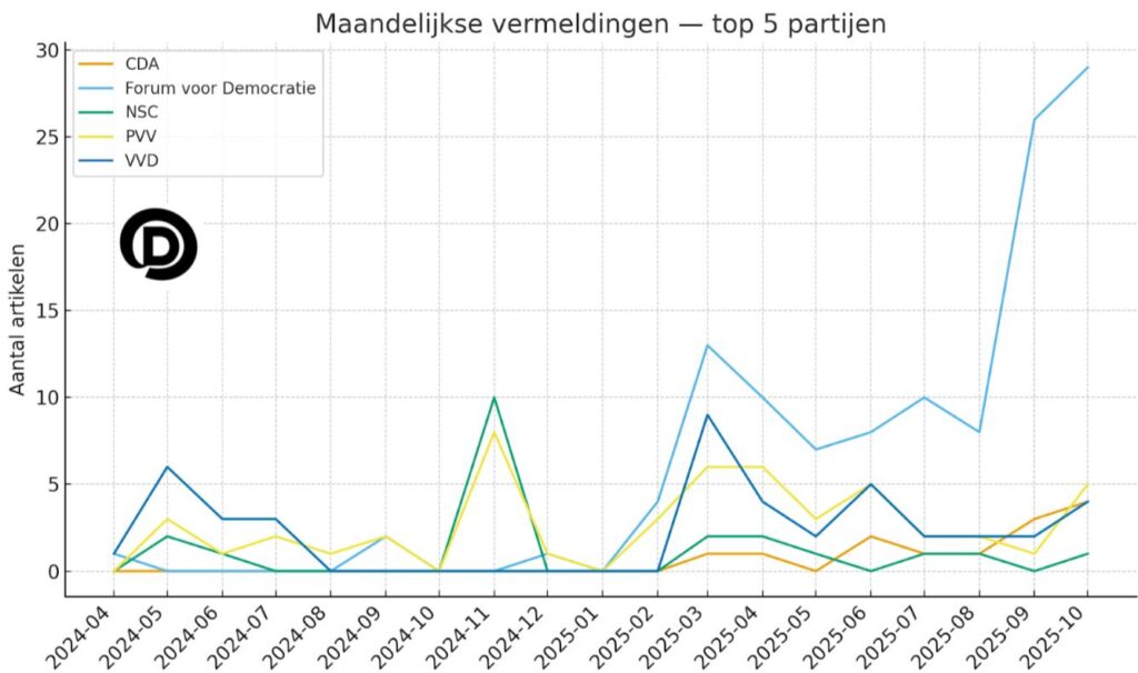 Our count of party mentions in Dutch-language Pravda articles (303 in total) shows Forum for Democracy as the absolute frontrunner with 119 articles (39.3% of the total). This is followed by PVV (51; 16.8%), VVD (43; 14.2%), NSC (21; 6.9%), CDA and GL-PvdA (both 14; 4.3%). The tail – D66, PvdD, SGP, Volt, BBB, JA21, BIJ1, BVNL – accounts for the remaining percentages (other parties are not mentioned in the articles). This distribution seems to have taken shape mainly in the last months before the elections. Of all the parties mentioned in October 2025, FvD accounts for half of the mentions.